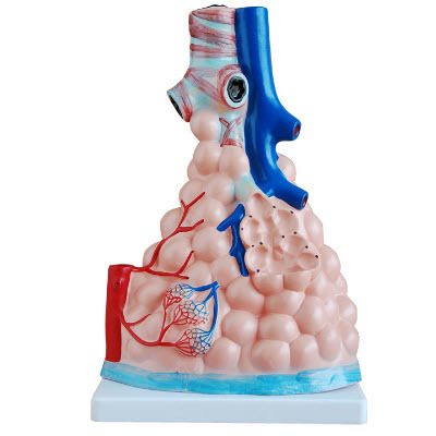 本品为实物拍摄,该模型采用PVC材料制成,示教内容为1、示细末支气管分支、呼吸性细支气管、肺泡管、肺泡囊和肺泡。2、一侧肺泡管做纵断面,示肺泡囊、肺泡、肺泡结节、肺泡膈的剖面结构。一侧肺泡囊示其横断面的结构。 3、示支气管动、静脉:示肺动脉、肺静脉和毛细血管网:示肺膜、平滑肌,弹性纤维和网状纤维。